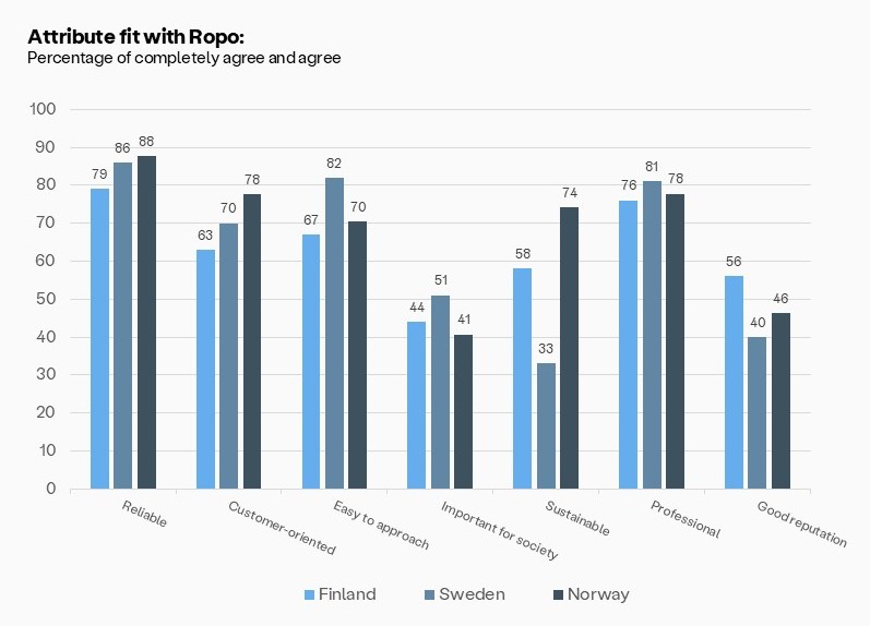 På spørsmål om å vurdere Ropo som tjenesteleverandør, rangerer kundene pålitelighet, profesjonalitet og imøtekommenhet høyest. Kvalitet og driftsstabilitet er de viktigste driverne for tilfredshet i alle markeder, som viser viktigheten av stabile tjenester, brukervennlige løsninger og høy teknisk oppetid.