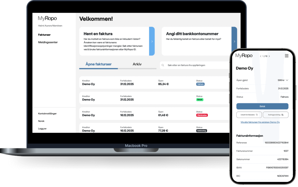 Logg inn med din personlige BankID og søk opp fakturaen med saksnummeret og MyRopo-ID-nummeret som er oppgitt på fakturaen eller inkassovarselet. Når du er logget inn i MyRopo kan du utføre en betaling, opprette betalingsplan eller kontakte kundeservice.
