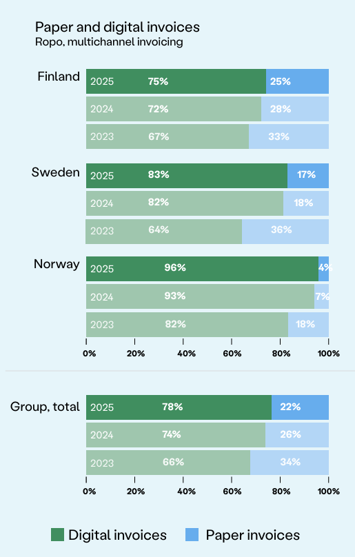 Digitalisering av fakturaprosesser er vårt viktigste bidrag til å redusere klimaavtrykket. I 2025 ble 78 % av alle fakturaer og dokumenter distribuert digitalt, en økning på fire prosentpoeng fra året før.